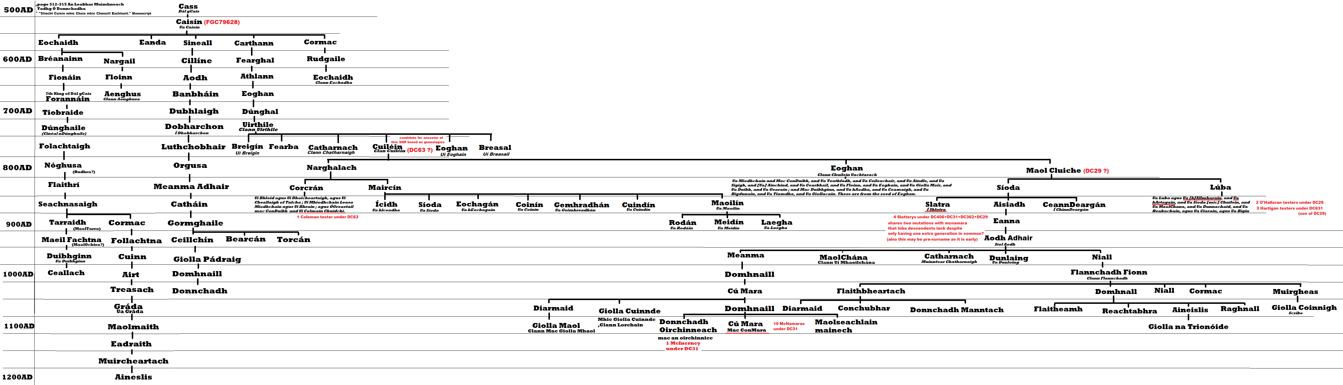genetic tree on the descendents of FGC79628 resembles the Uí Cais&iacut; genealogies in that Caisín (FGC79628) has three sons (Sineall, Eochaidh, Cormac) which ultimately spawn smaller kindreds (which may reflect DC87, BY39756, DC25) and one son (Carthann) who's descendent Cuiléin (ancestor of Clan Cuiléin) ultimately spawns a much larger proliferation which probably reflects DC63.Had issue:* Breigín - Ancestor of Uí Breigin* Fearbla* Catharnach - Ancestor of clann Chatharnaigh.* Cuiléin* Eoghan - Ancestor of Uí Eoghain* Breasal - Ancestor of Uí Breasail